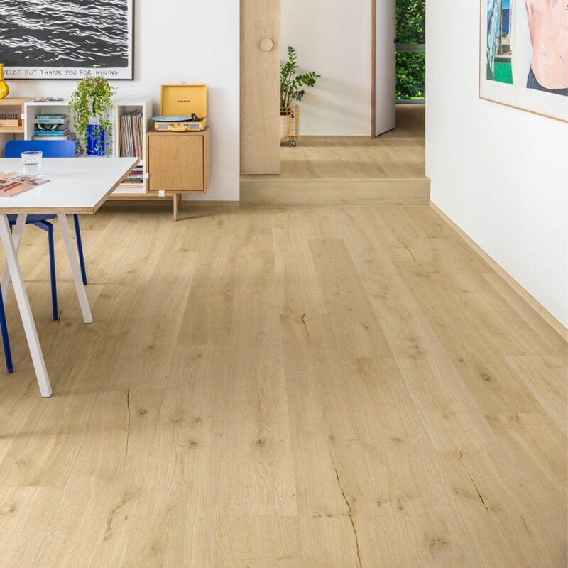 Ce stratifié Chêne Coton haut de gamme au design chaleureux inspiré du bois, allie élégance naturelle et performance durable. Sa teinte beige avec des nuances subtiles lui donne un aspect lumineux. Conçu pour un usage intensif avec sa classe d’usage 33, ce revêtement offre une résistance élevée face aux sollicitations du quotidiens. Grâce à sa technologie HydroSeal, la surface est parfaitement étanche, empêchant l’eau de pénétrer dans les joints. Il peut être posé dans toutes les pièces de votre intérieur. Compatible avec le chauffage au sol, ce stratifié combine confort et performance thermique. Son système Uniclic permet une pose flottante rapide et précise conforme aux normes, offrant une installation fiable et durable. Ce modèle peut s’associer au bâton rompu Chêne Cardamome de la collection Impressive Design.